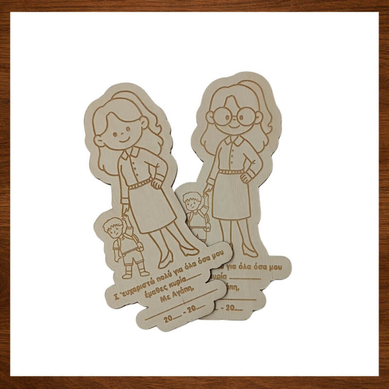 Αν ψάχνεις ένα προσωποποιημένο ξύλινο δώρο για δασκάλα, αυτό το αναμνηστικό μαγνητάκι είναι μια ζεστή ευχαριστία που μένει για χρόνια. Το σχέδιο δείχνει τη δασκάλα με το παιδάκι και αποτυπώνει μια όμορφη στιγμή της τάξης. Η αφιέρωση γράφει «Σ’ ευχαριστώ πολύ για όλα όσα μου έμαθες» και δίνει στο δώρο συναίσθημα και νόημα.